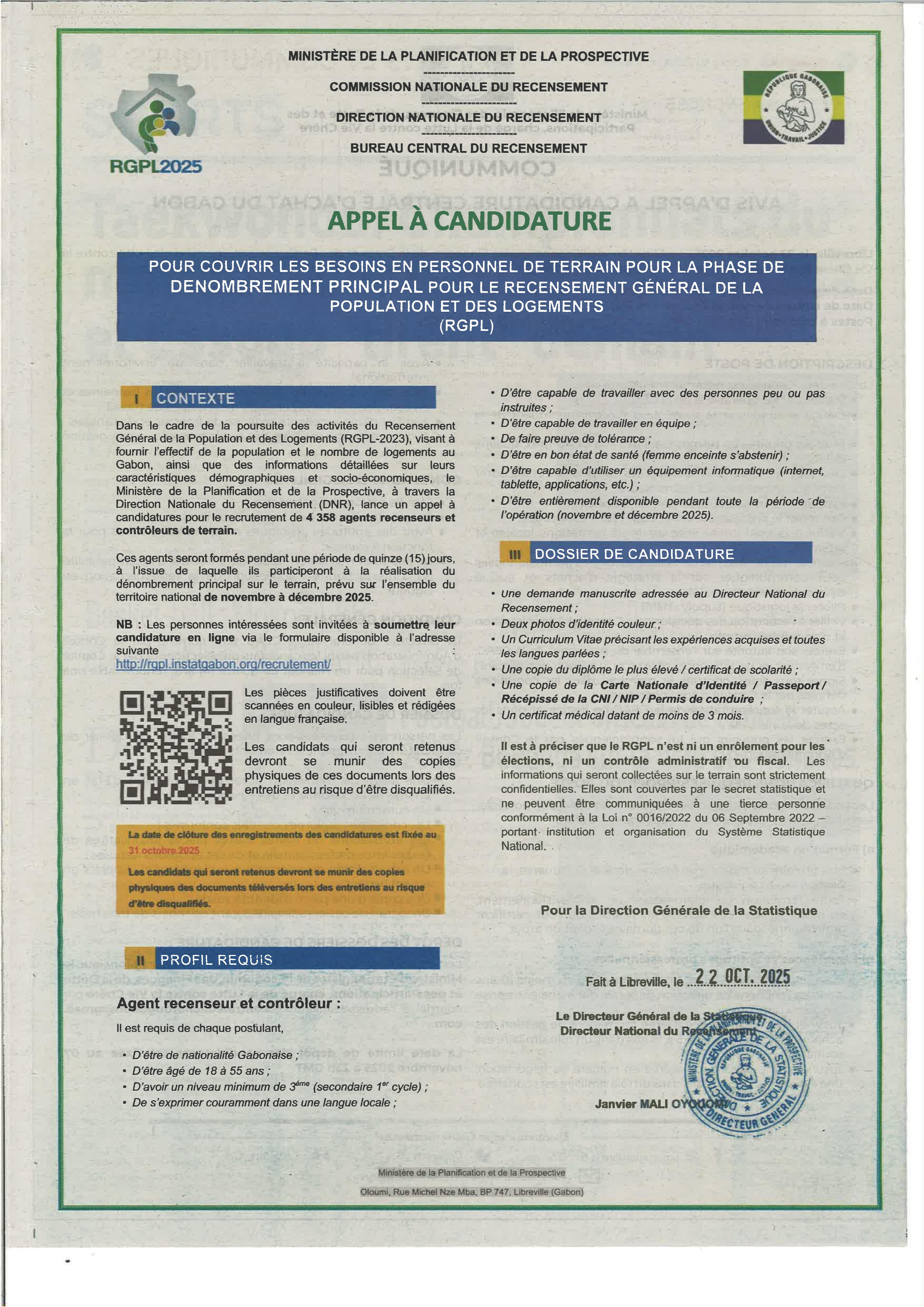 Les personnes intéressées sont invitées à soumettre leur candidature en ligne via le formulaire disponible à l'adresse suivante: http://rgpl.instatgabon.org/recrutement/.