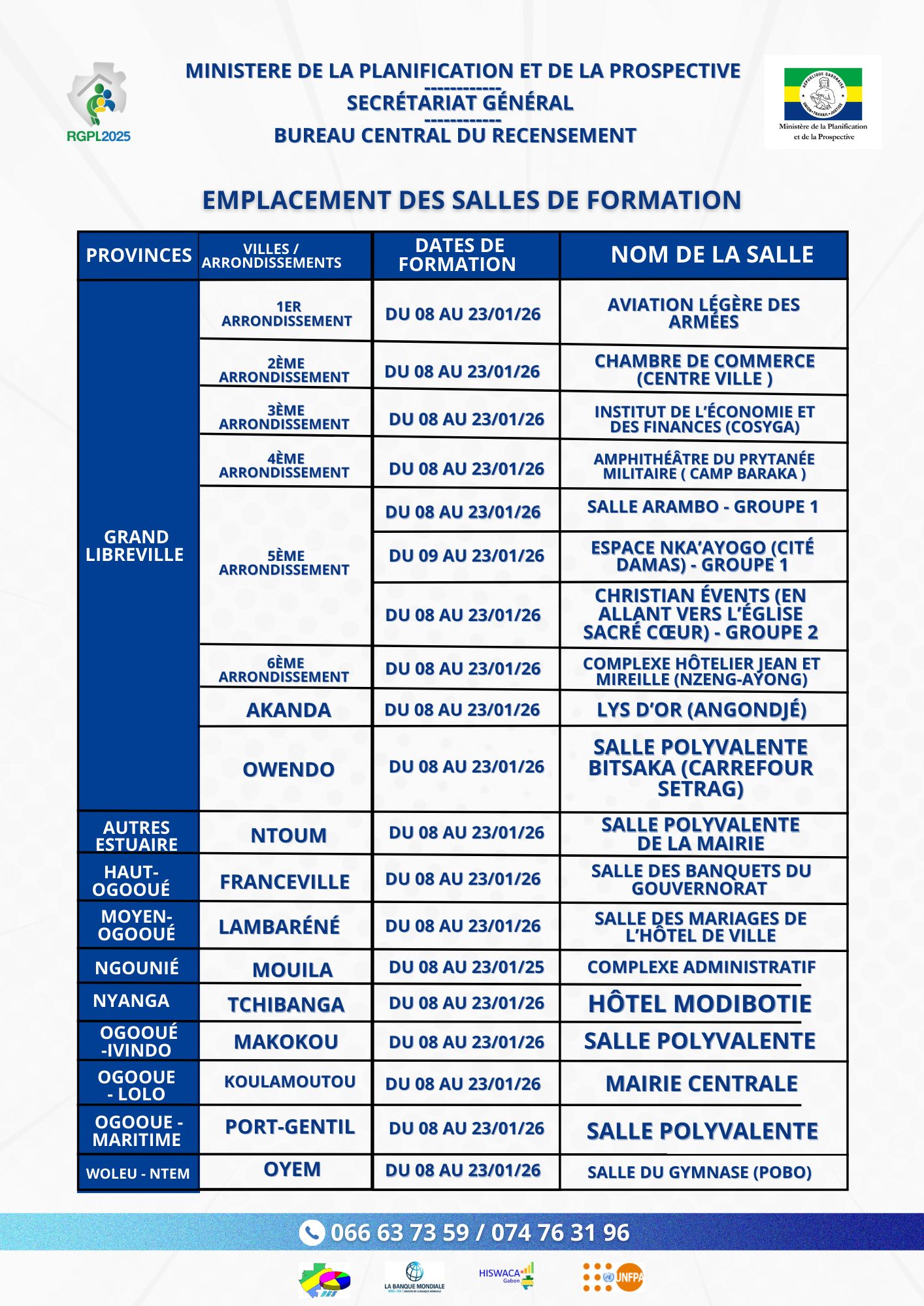 Sous la tutelle du Ministère de la Planification et de la Prospective, le Bureau Central du Recensement organise les formations des agents recenseurs et contrôleurs dans les sites indiqués sur l’affiche ci-jointe